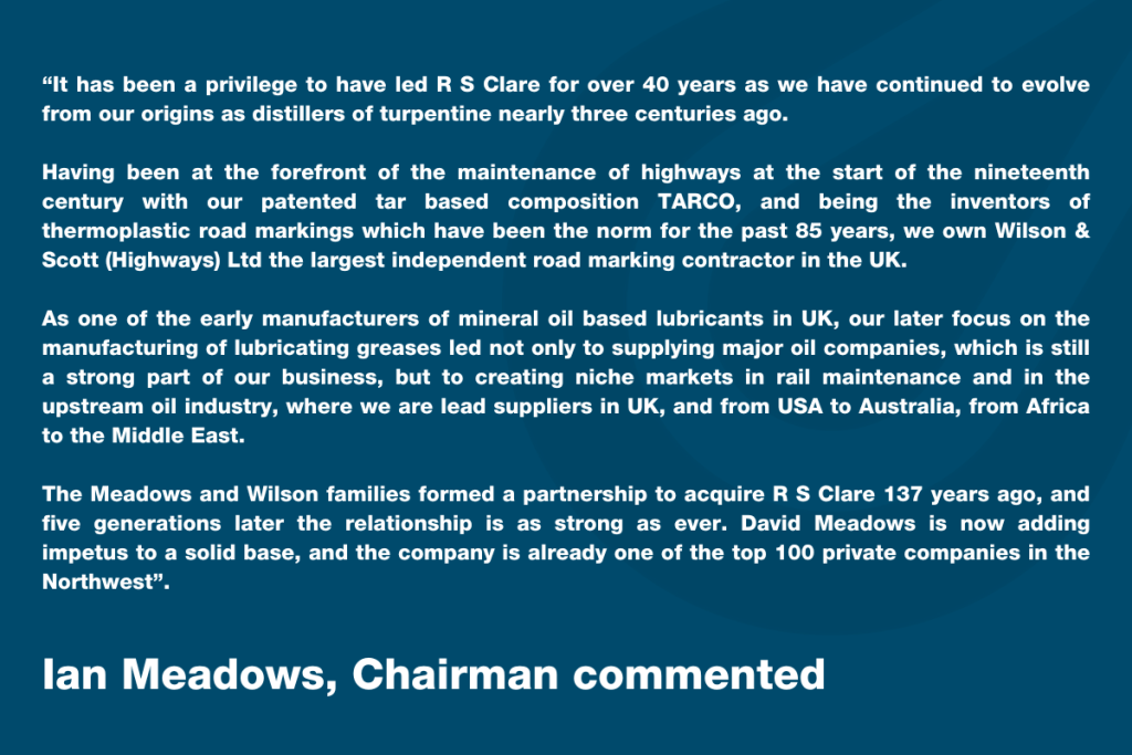 Under Ian’s stewardship, RS Clare has made major investments in its facilities and technology, expanded into new markets and developed innovative products that continue to support customers around the world. Today, it is a byword for quality lubricants, providing speciality greases that deliver significant benefits and cost savings to clients in the rail, wire rope, road markings, private label and oil & gas industries.